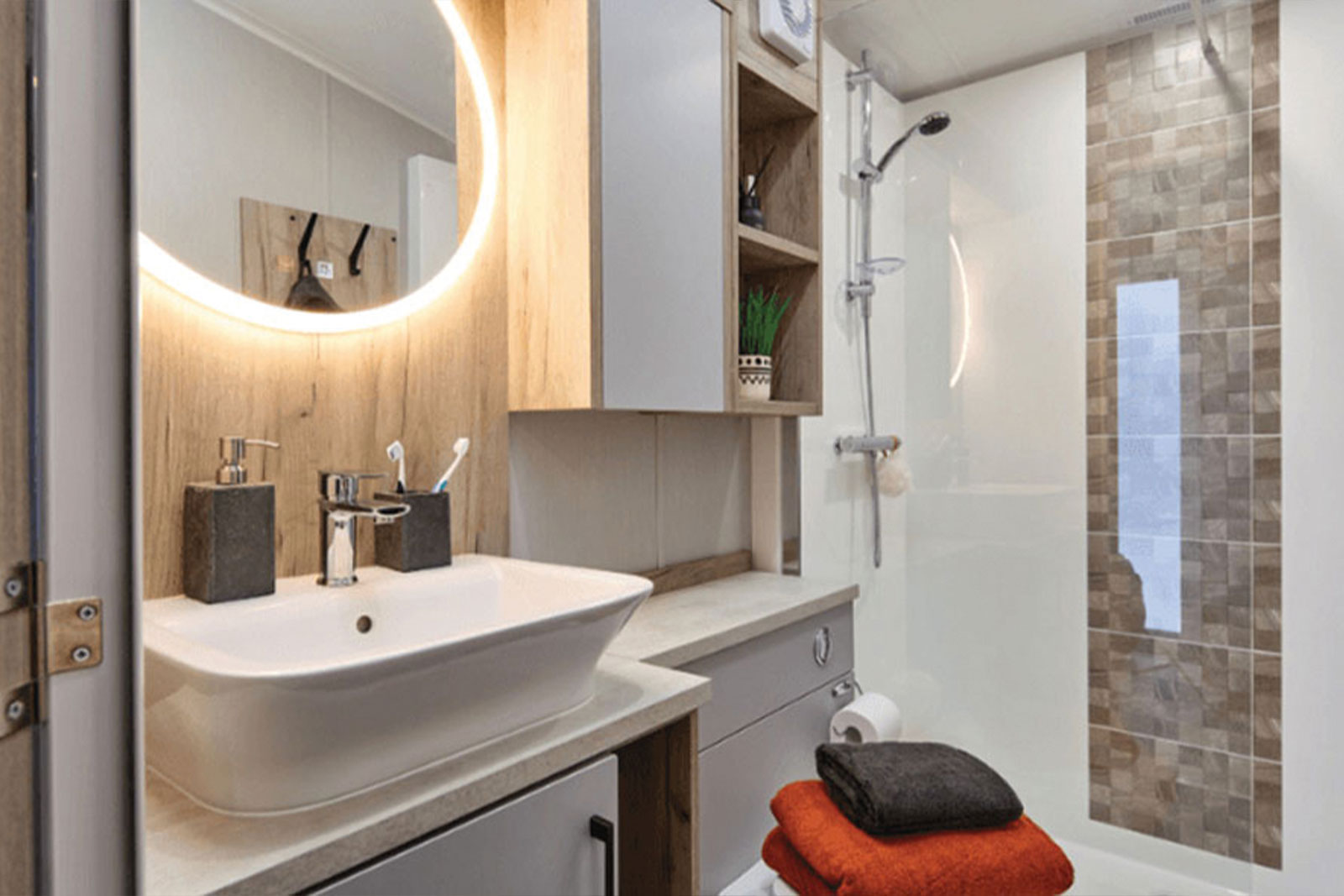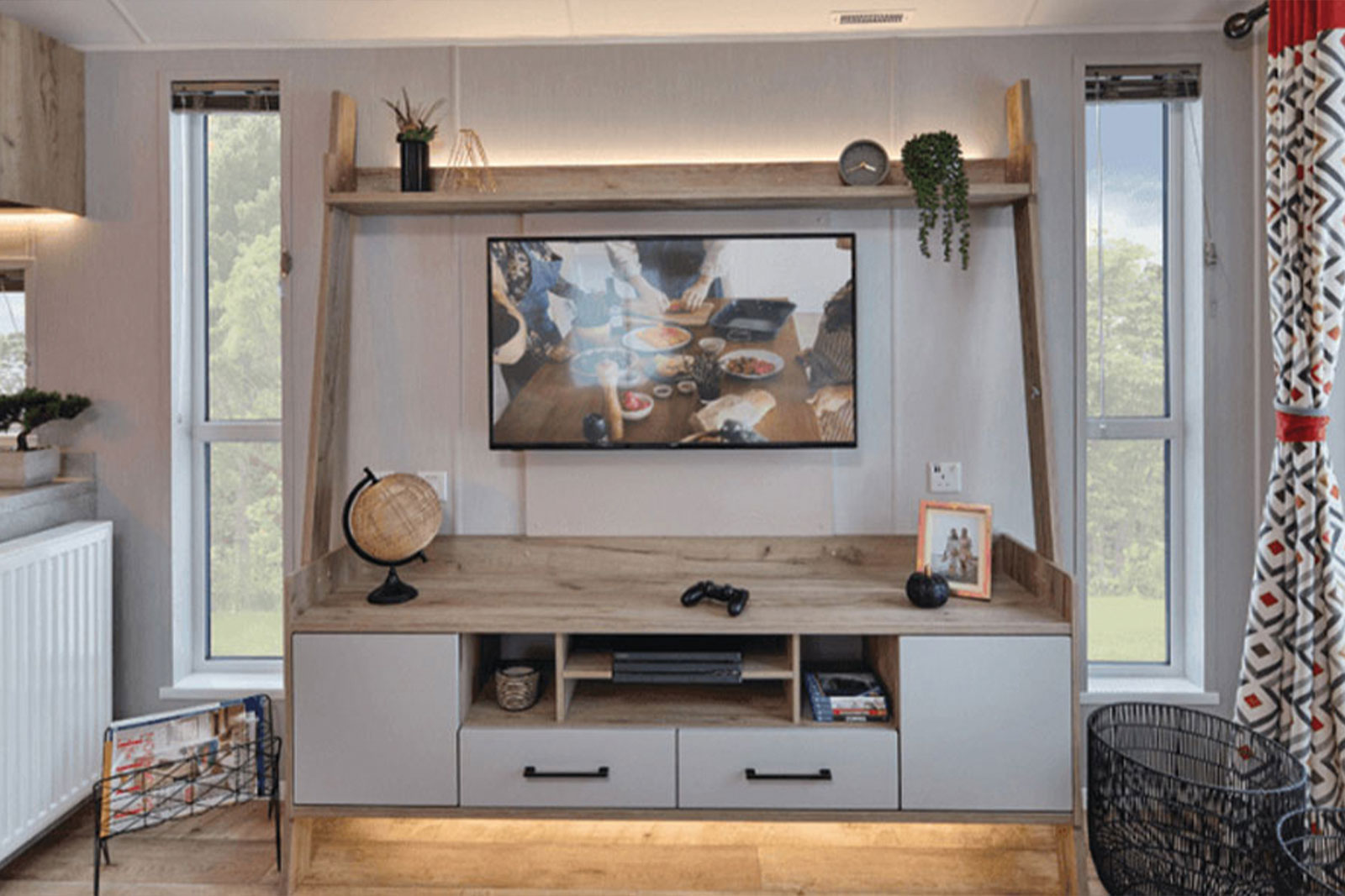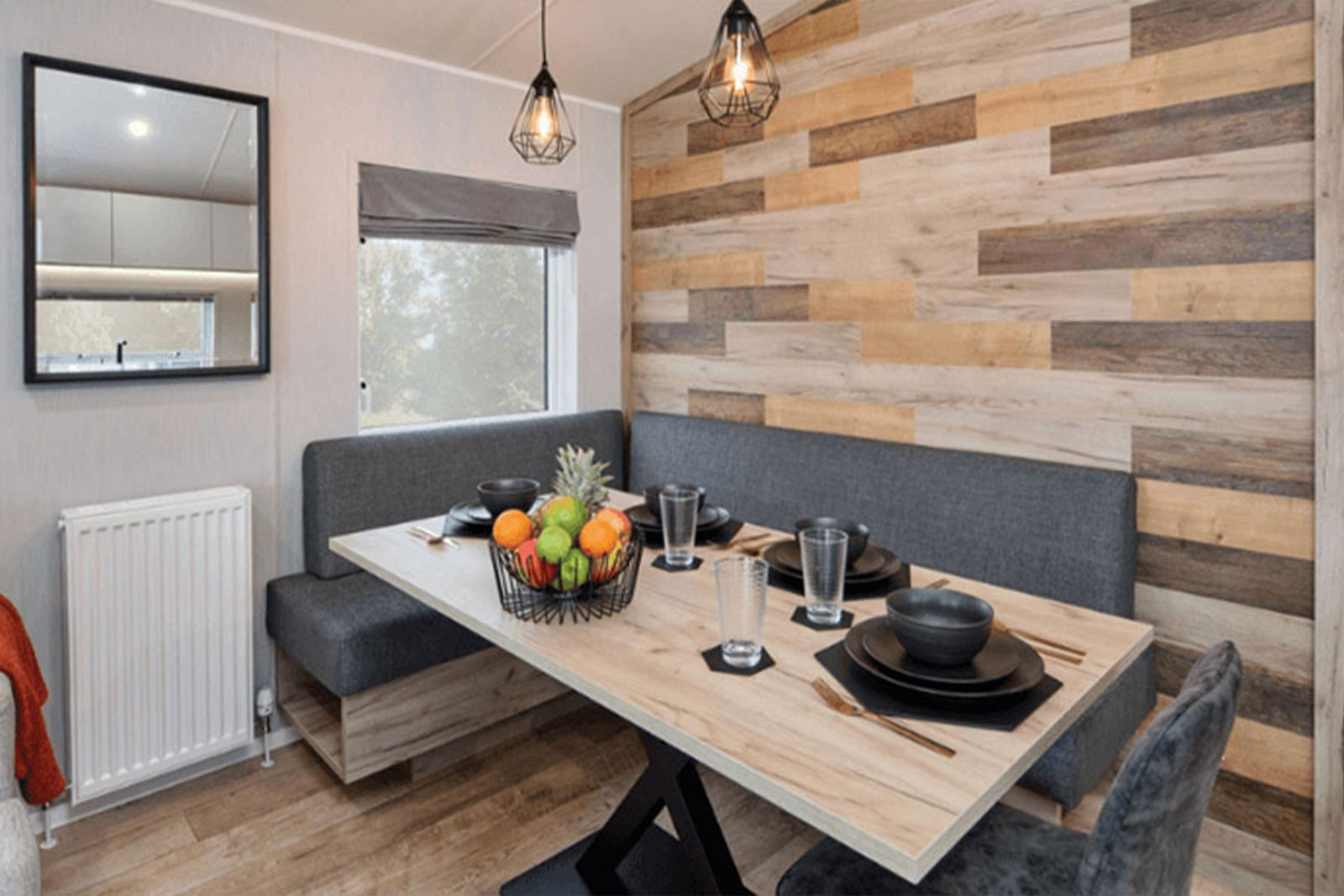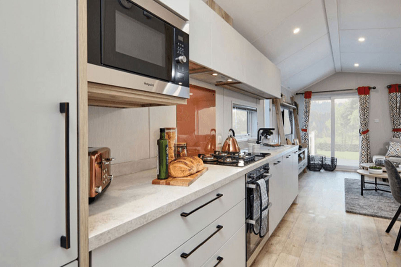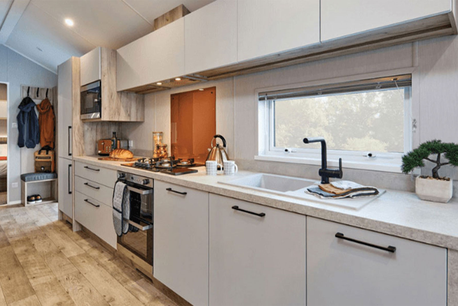 Whether you are snuggling up in front of the TV, gathering around the dinette, or cooking up a storm in this static caravan’s practical linear kitchen, contemporary living has never been so easy.